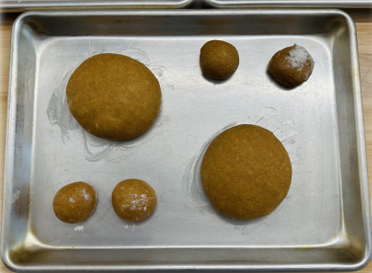 Round the 90-gram dough pieces and place onto a greased sheet pan (2 per ¼ sheet, 4 per ½ sheet, and so on).