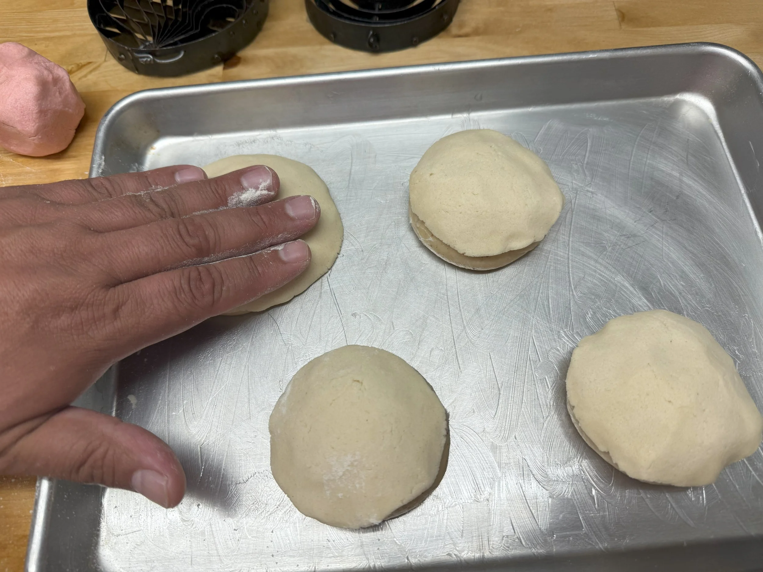Place the disc carefully over each bizcocho dough ball, pressing gently so the disc sticks. 📷