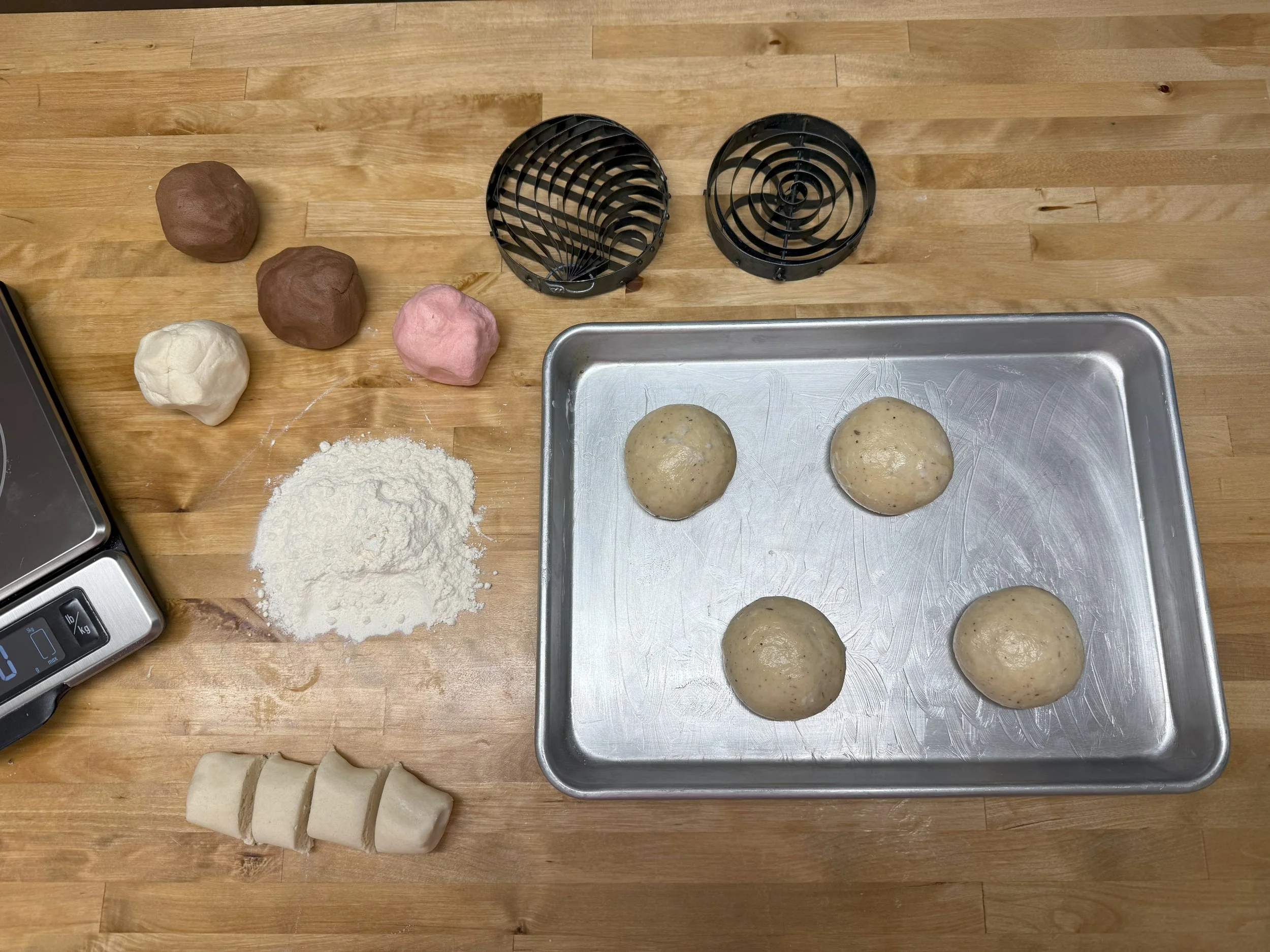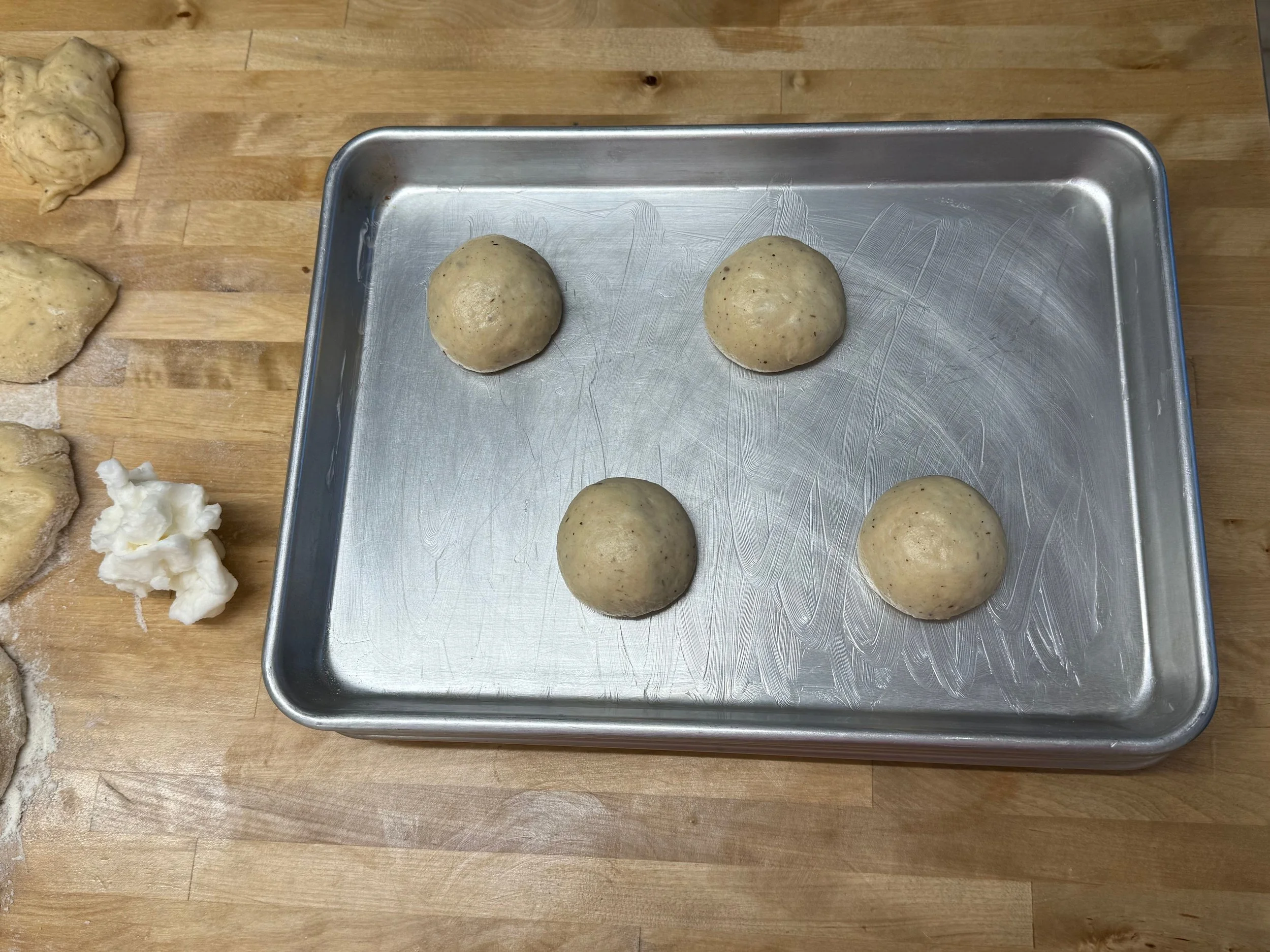 Round the dough pieces and place them on the greased baking sheet (about 4 per sheet tray). Leave 2 inches of space between each dough ball. 📷