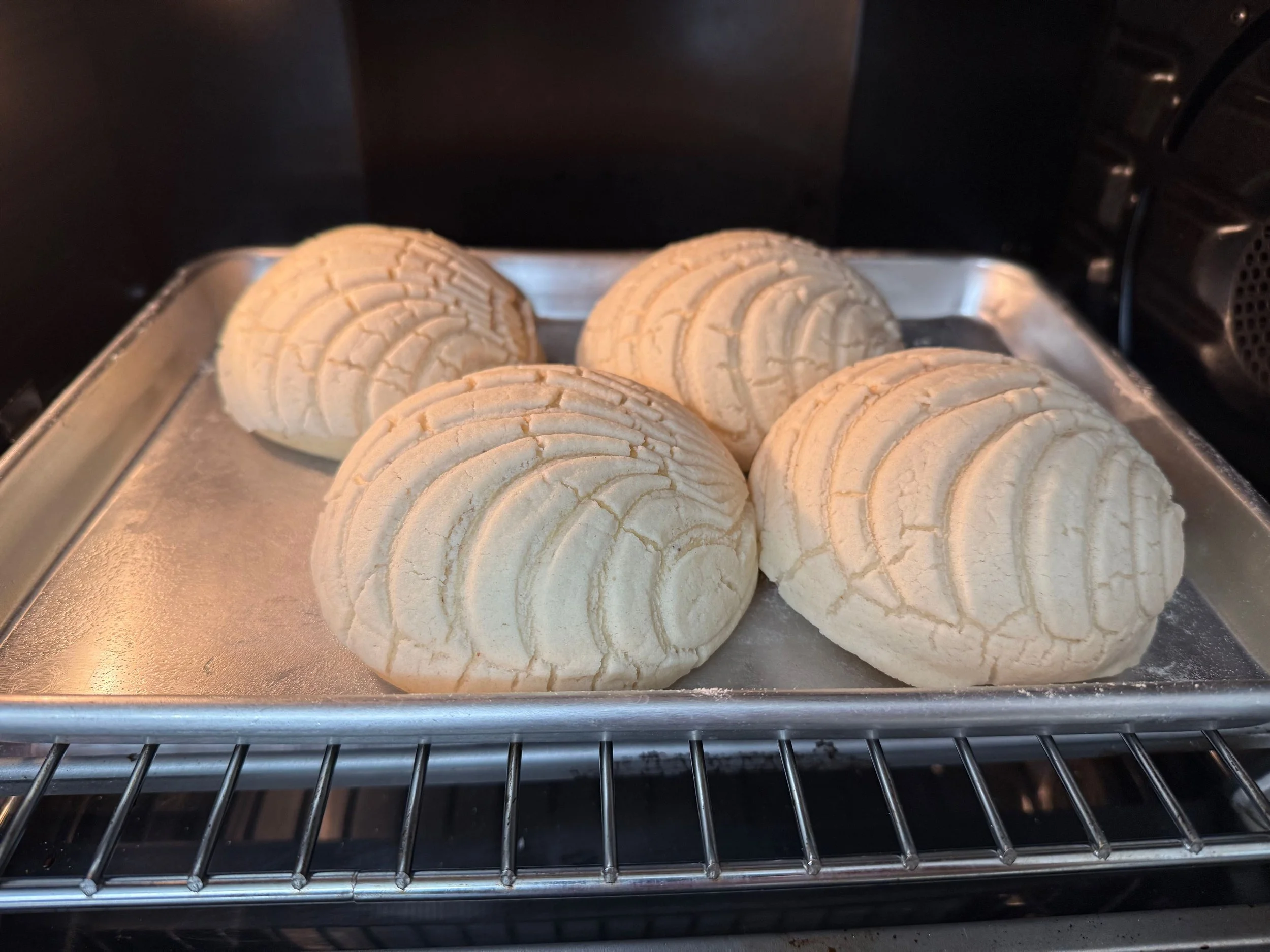 During proofing and baking, the concha pattern serves as your guide. As the dough rises, the seashell pattern will take shape. Once the sugar topping starts to separate at the “cuts” in the design, the conchas are ready to be placed in the oven. The pattern will later brown during baking, indicating that the conchas are done baking.